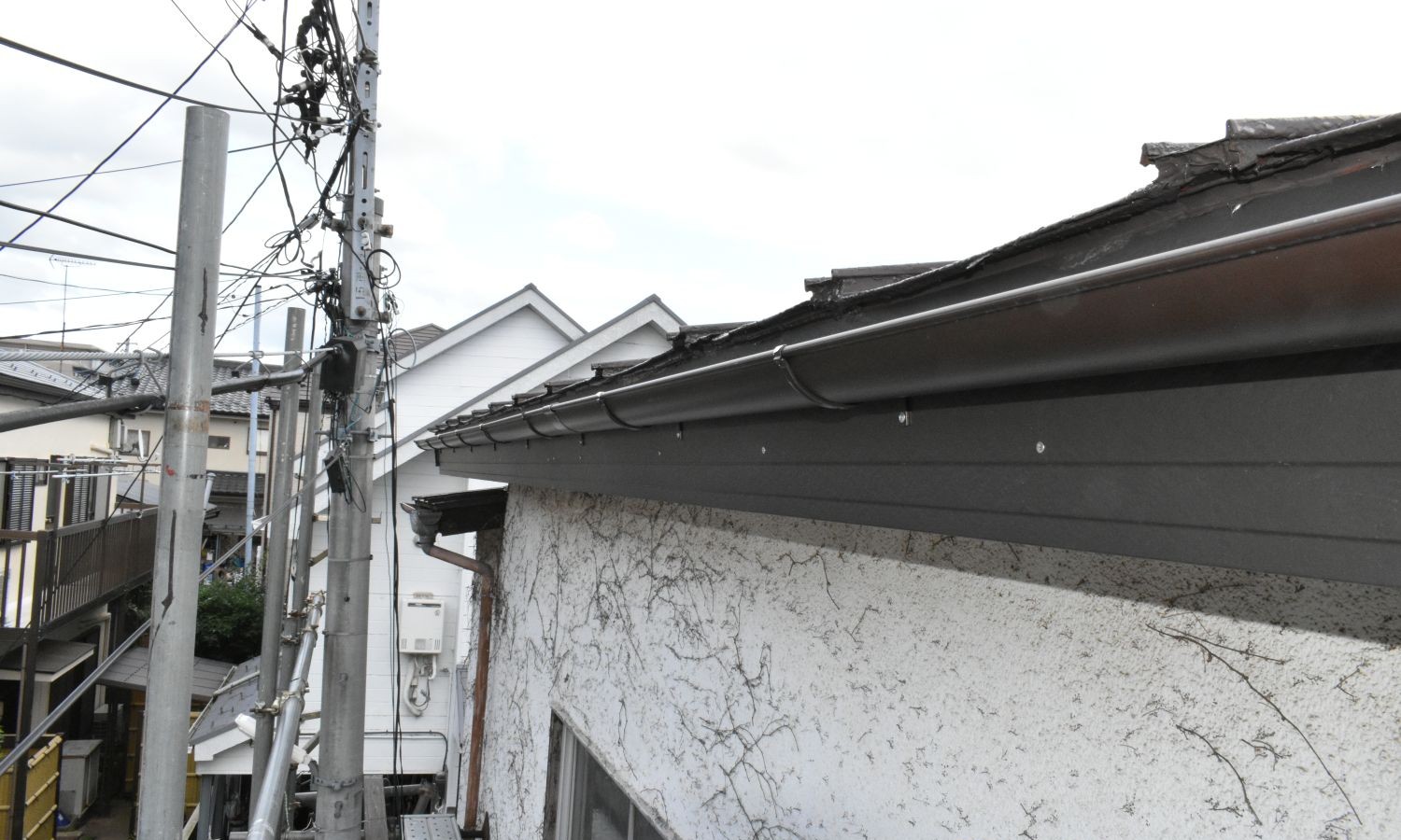 破風板が腐り、雨樋が破損していたので下地を補強し破風板と雨樋を交換しました。